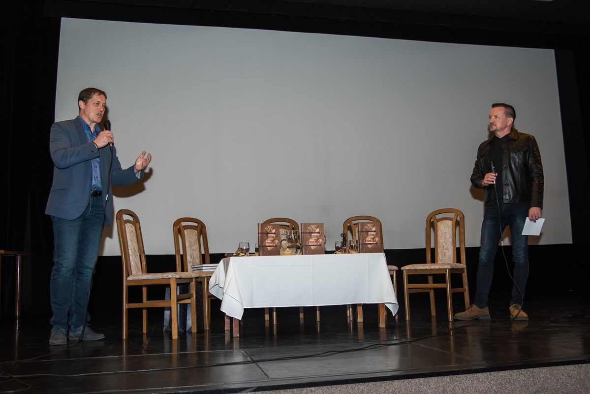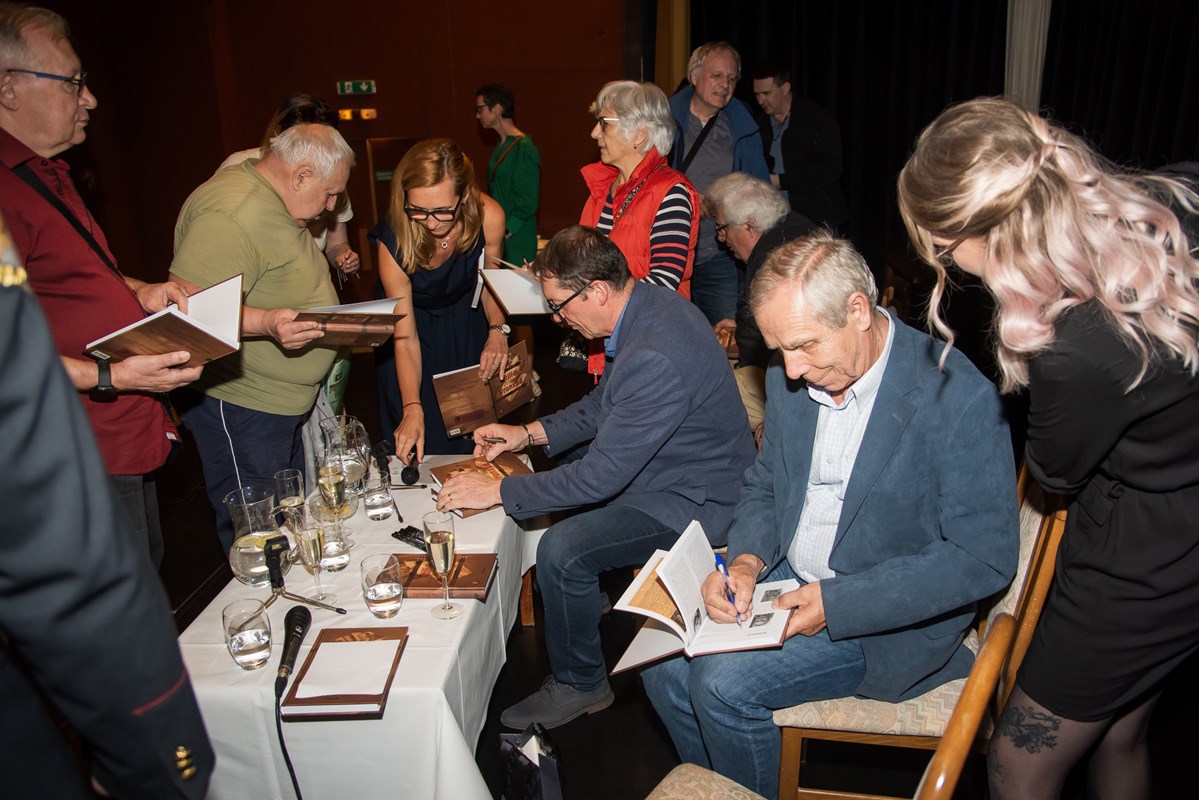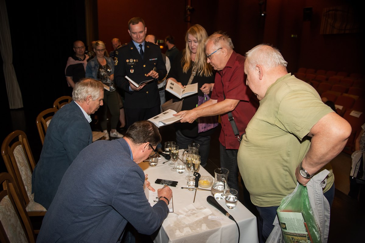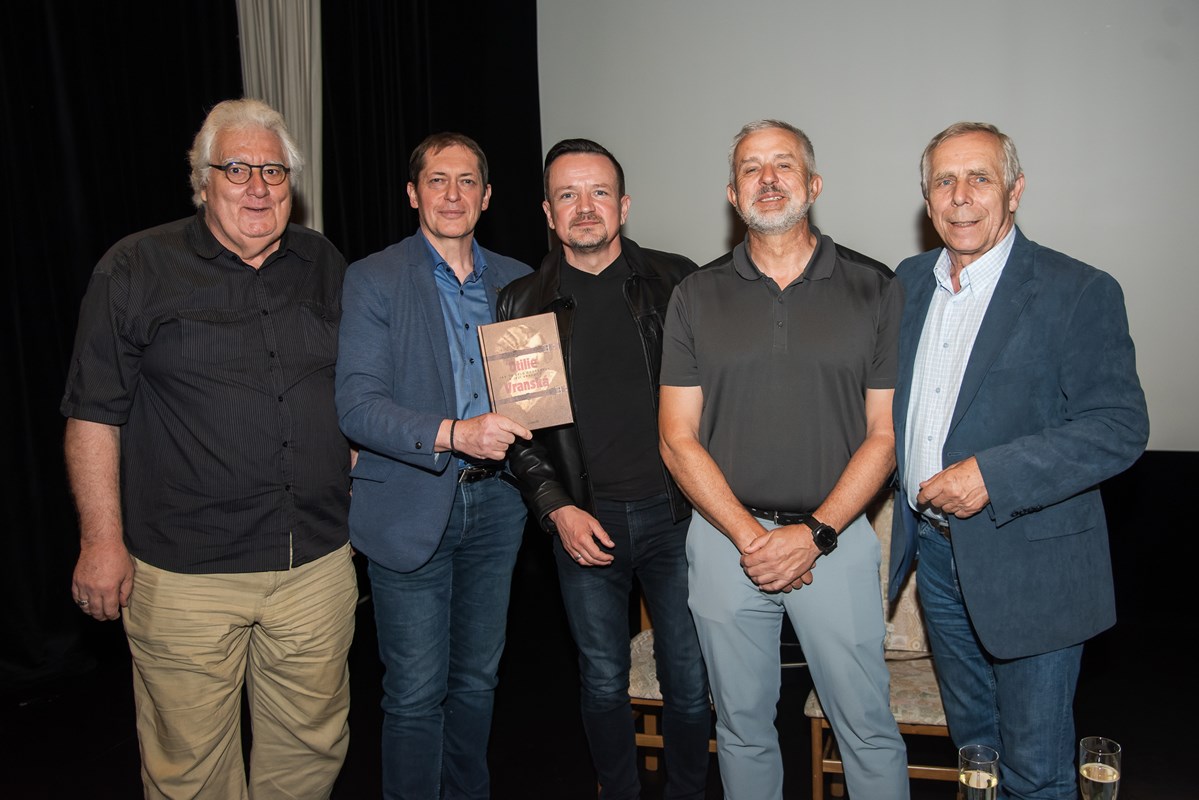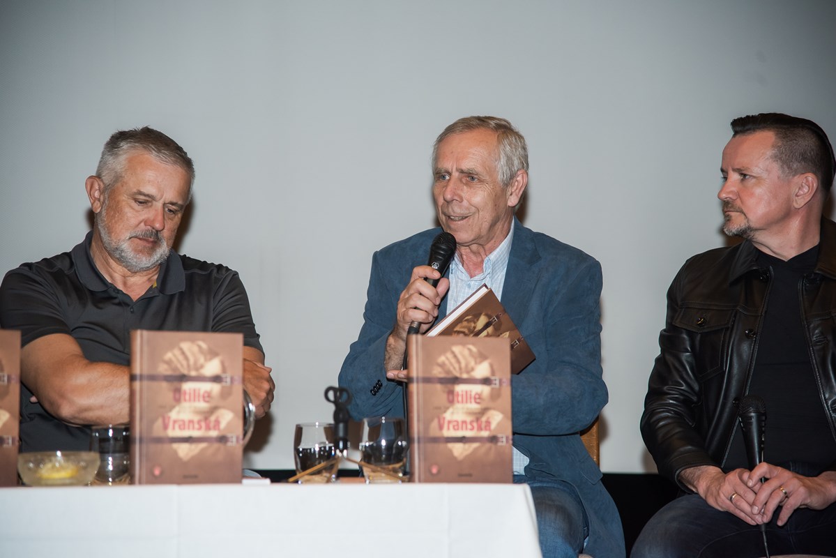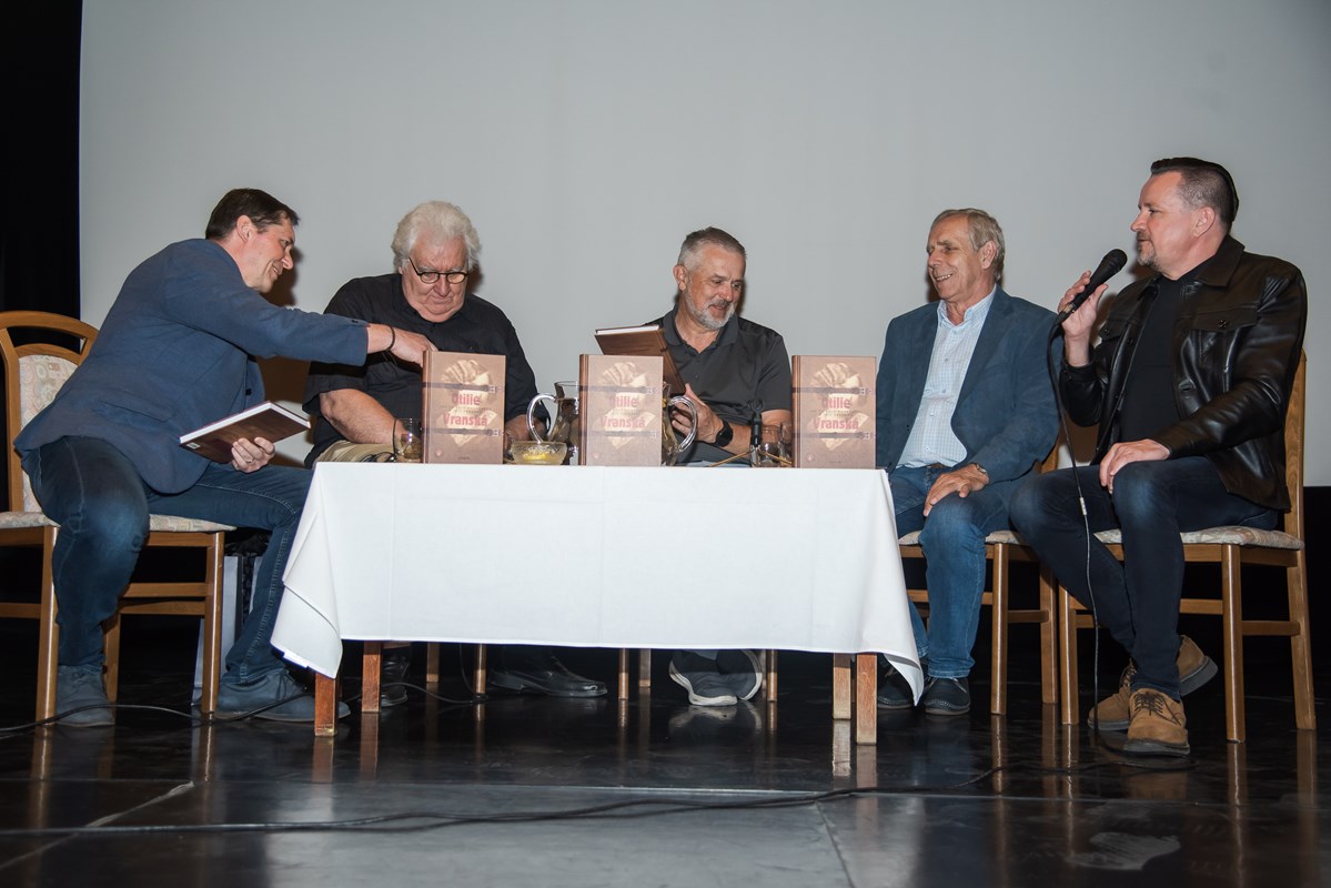Knihu pokřtili (zprava) Mirek Vaňura (moderátor), Josef Lottes, Daniel Vaněk, Radek Galaš, Miloš Vaněček, Katka Janebová, Markéta Kyzlinková