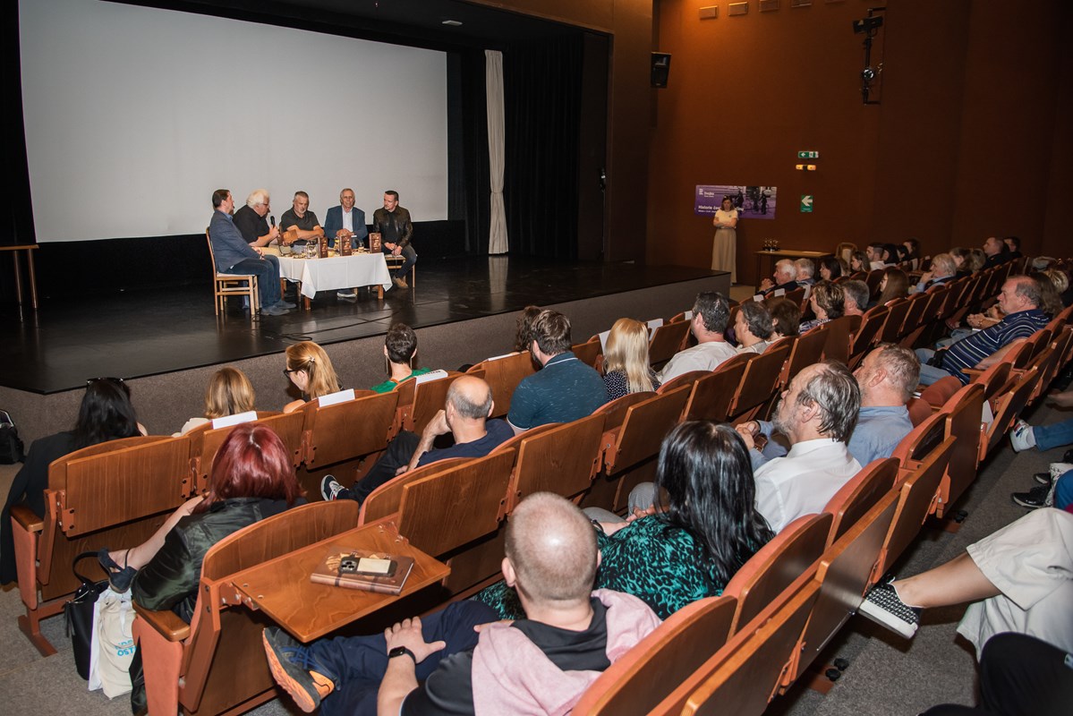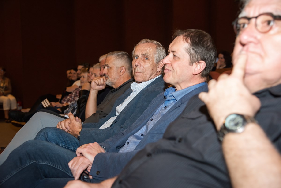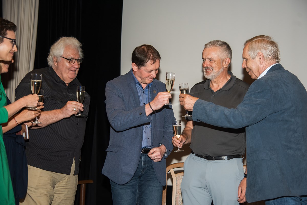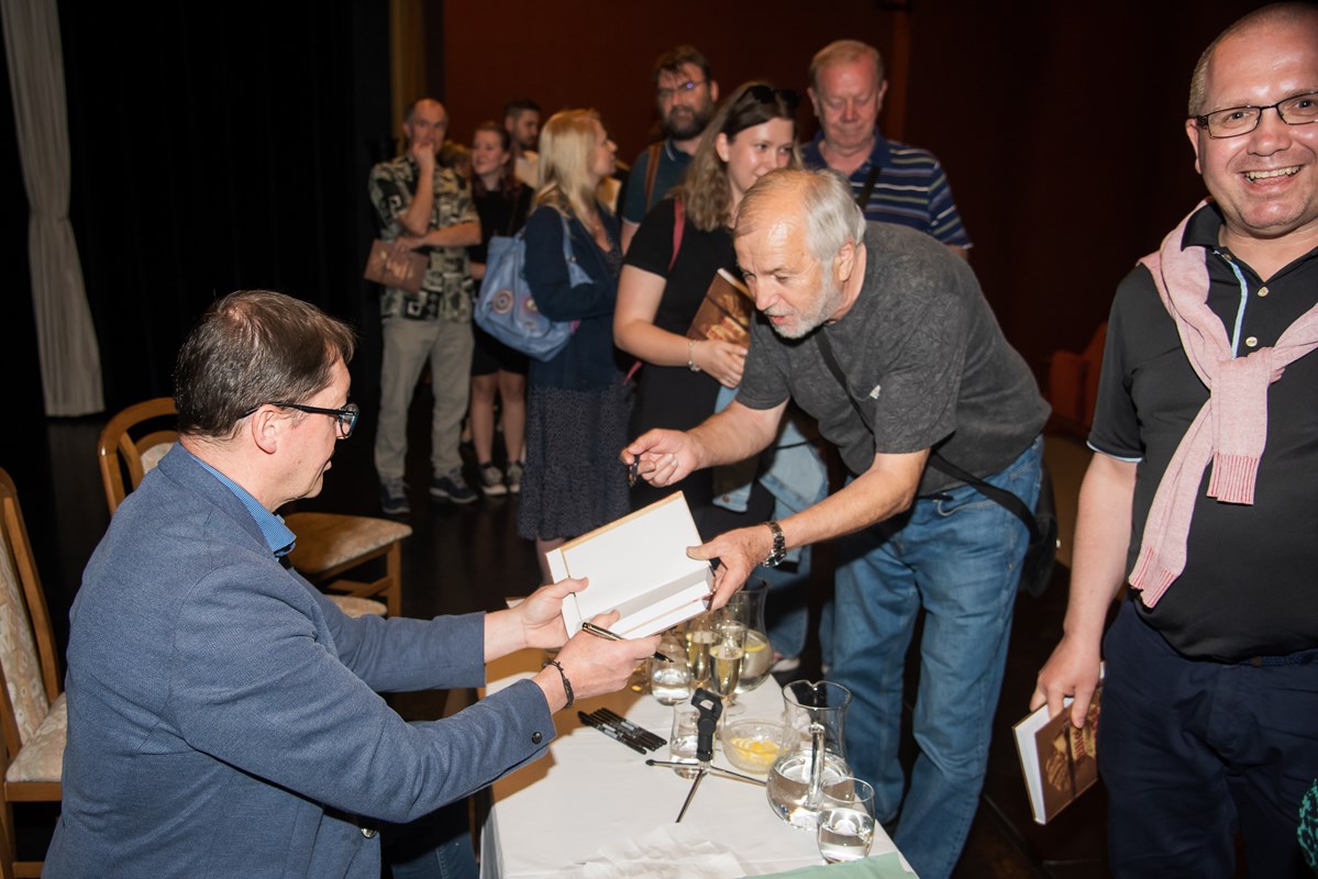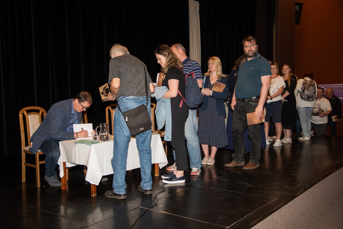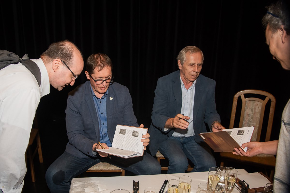 Knihu pokřtili (zprava) Mirek Vaňura (moderátor), Josef Lottes, Daniel Vaněk, Radek Galaš, Miloš Vaněček, Katka Janebová, Markéta Kyzlinková