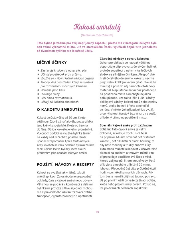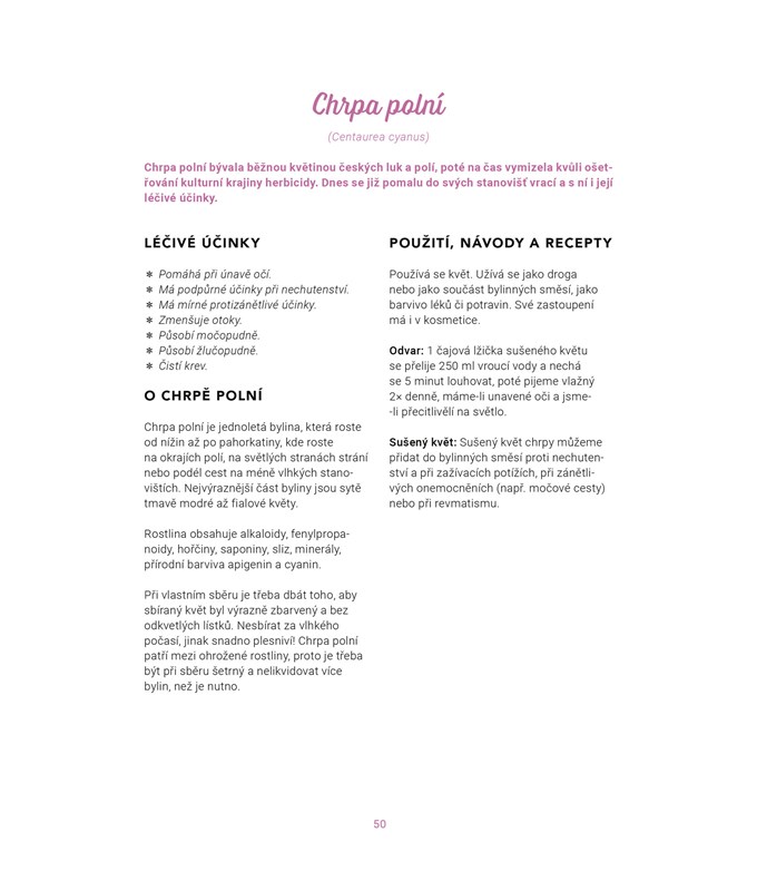 Velká kniha bylin a rostlin, které známe z české přírody, vhodná pro zapálené bylinkáře, milovníky lidového léčitelství nebo majitele zahrad. Encyklopedie i praktická příručka v jednom plná fotografií, užitečných rad a zdravotních tipů, napsaná autory stejnojmenného úspěšného blogu. Najdete zde nejznámější a nejpoužívanější bylinky s návody, jak je pěstovat, k čemu je používat a jak si připravovat léčivé přípravky.