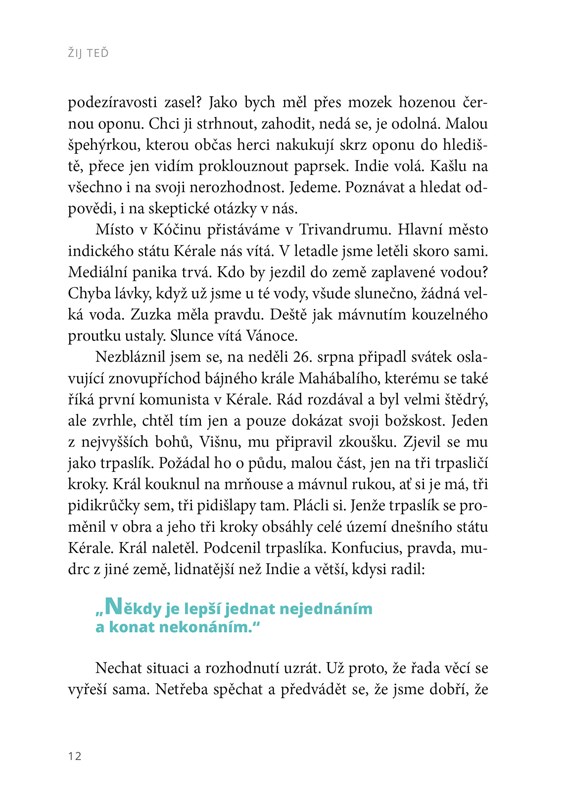 Žij teď. Dvě slova s velkou silou. Patláme se v tom, co bylo, bojíme se, co přijde, a zapomínáme žít. Existuje recept na život? Karel Voříšek vyrazil na jih Indie za ajurvédou, vědou o životě. Při svém putování odkrývá její tajemství. Od výborného jídla, přes tajemné léčení až po zklidňující meditace. S nadhledem popisuje svoji občas nesnadnou cestu poznávání sebe sama. Co nám brání ve štěstí, proč si necháme kecat do života a jak trénovat kouzlo přítomného okamžiku? To je jen pár otázek, na které hledá odpověď. Život je tak jednoduchý, komplikujeme si ho jen my sami. Co s tím? Nechte se inspirovat knihou, kterou držíte v ruce.