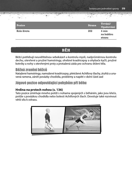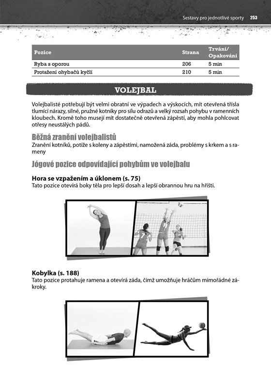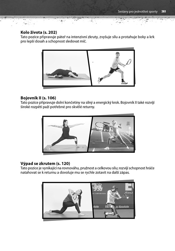 Exkluzivní a neocenitelné jsou příklady využití jógových pozic v konkrétních postaveních či pohybech sportovců a hráčů ve fotbale, basketbale, baseballu (softballu), hokeji, volejbalu, golfu, raketových sportech, lyžování, plavání, běhu, cyklistice a bojových uměních. U každého sportu najdete vždy TOP 5 doporučených nejvhodnějších jógových pozic, které mají pro něj největší přínosy, spolu s fotografiemi, které porovnávají jógové pozice s reálnými sportovci v akci.