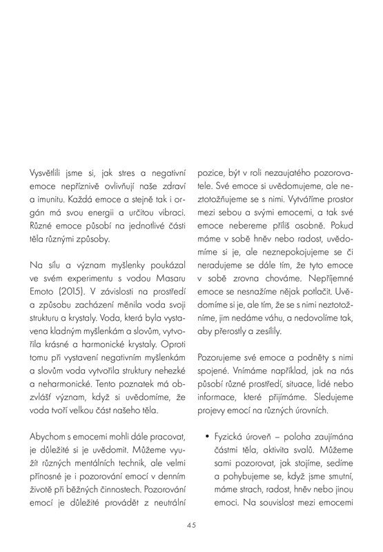 Autorka v knize také popisuje přístupy staré tisíce let, které současná doba znovu objevuje – tedy význam našich emocí a úzké propojení mentální a fyzické složky člověka. A také roli emocí, kterou hrají v prožití harmonického a spokojeného života.