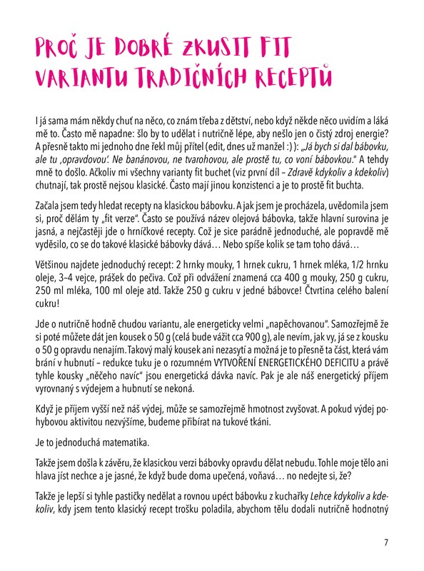 Cílem této kuchařky je ukázat, že jíst lépe, nutričně hodnotně, bez pocitu prohřešků vůči zdravé výživě či když chceme zhubnout lze, a to bez nutnosti vzdávat se všeho, co nám chutná. I když jsou to třeba ta typická jídla, která řadíme do těch tzv. „špatných“- např. fast food , hamburger, pizza, smažené čínské nudle nebo kynuté koláče.
