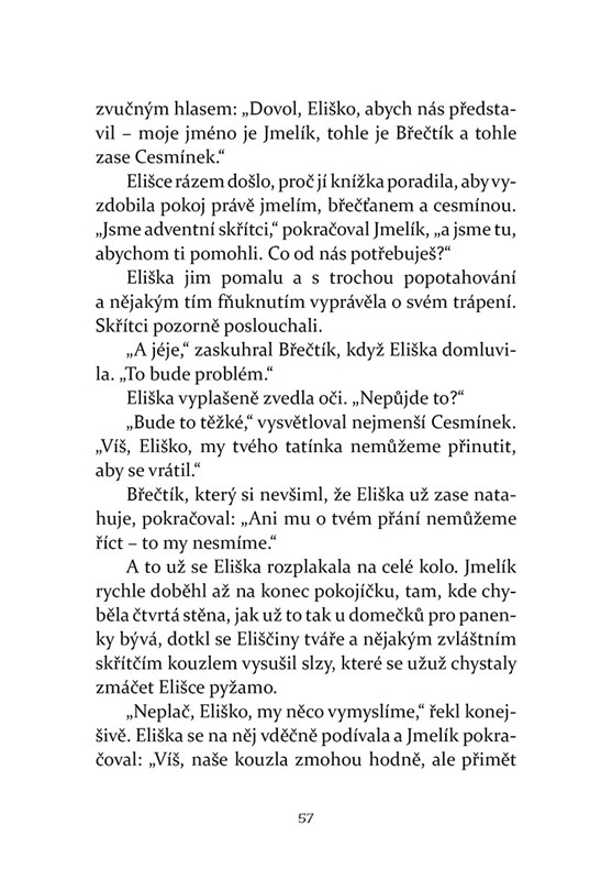 „Tak vidíš. Advent, to je vlastně takové čekání na zázrak, na štěstí a na lásku. A to je přesně to, co ty potřebuješ, aby se tatínek vrátil. Vlastně úplně stačí přivolat adventní skřítky, ti ti určitě pomůžou.“
