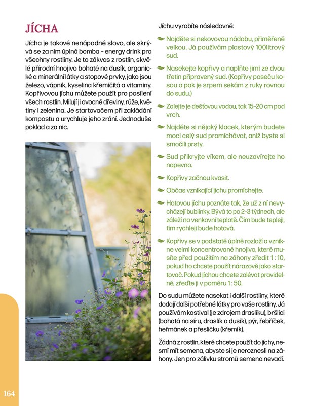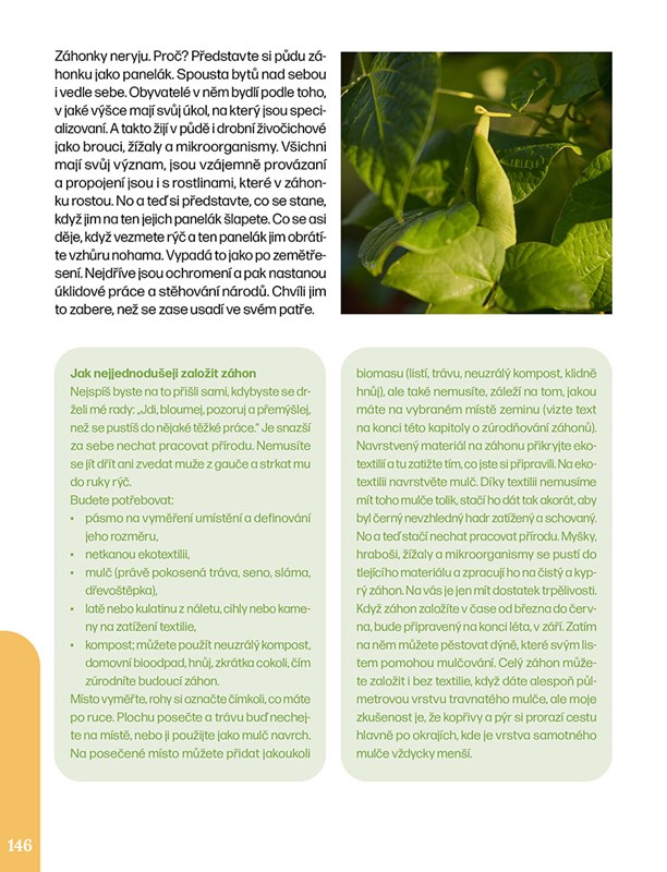 Kniha plná informací, rad a návodů vás provede světem půdy, vody, stromů, keřů, luk, trvalek a zeleniny z pohledu ženy, která více než desítku let tvoří svou hektarovou zahradu sama, s vizí částečné soběstačnosti a trvale udržitelného způsobu života.