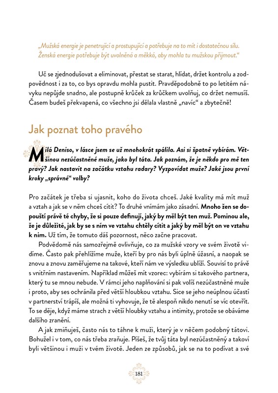 K tomu, abychom skutečně zažívali spokojenost a radost ve vztazích, existuje jediný recept, a tím je láska, kterou dáváme sami sobě. Vůbec není řeč o sobecké sebestřednosti. Myslím tím laskavost, jemnost a trpělivost, kterou můžeme projevovat sami sobě. Každou chvílí, každou myšlenkou, každým skutkem, který uděláme.